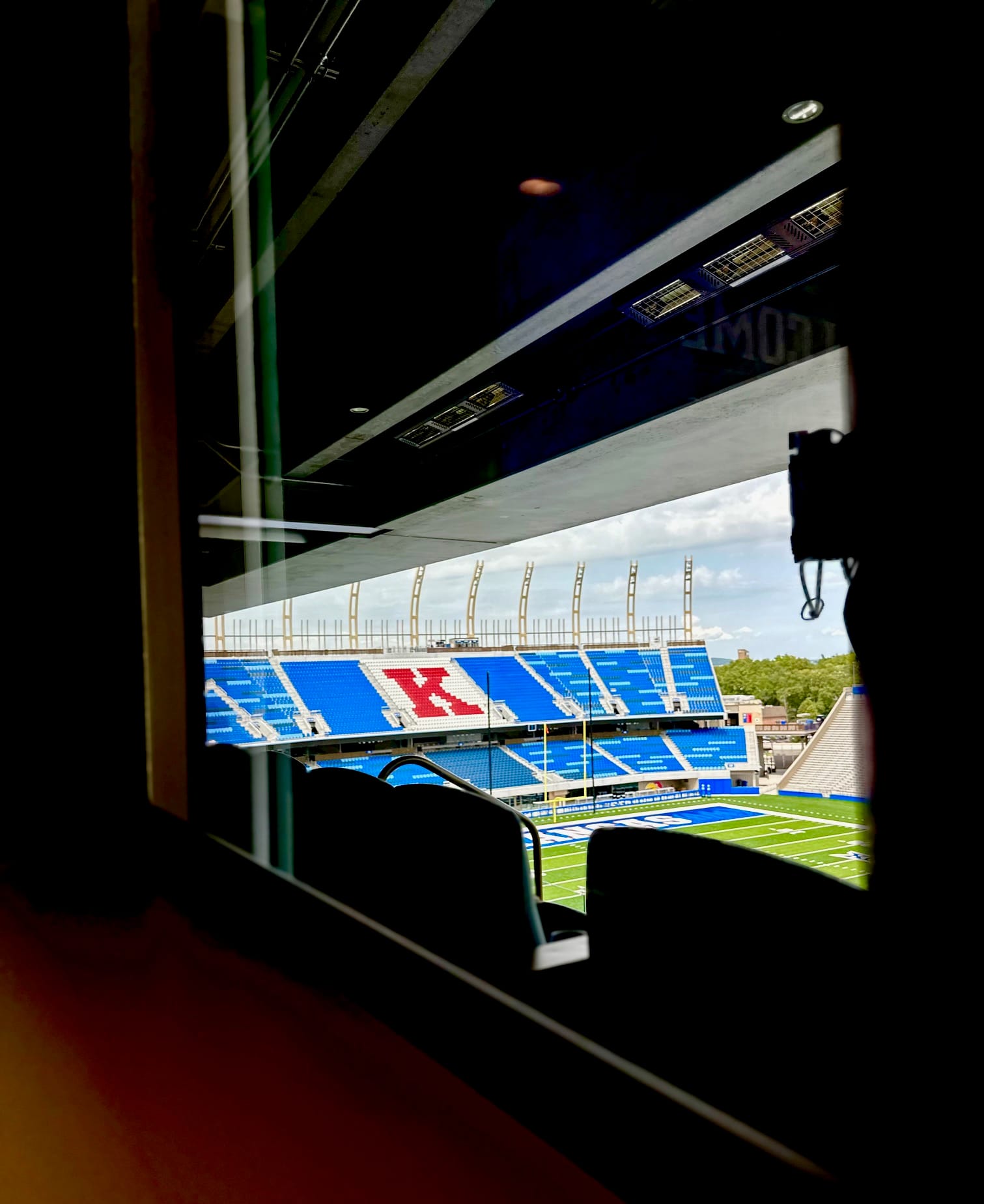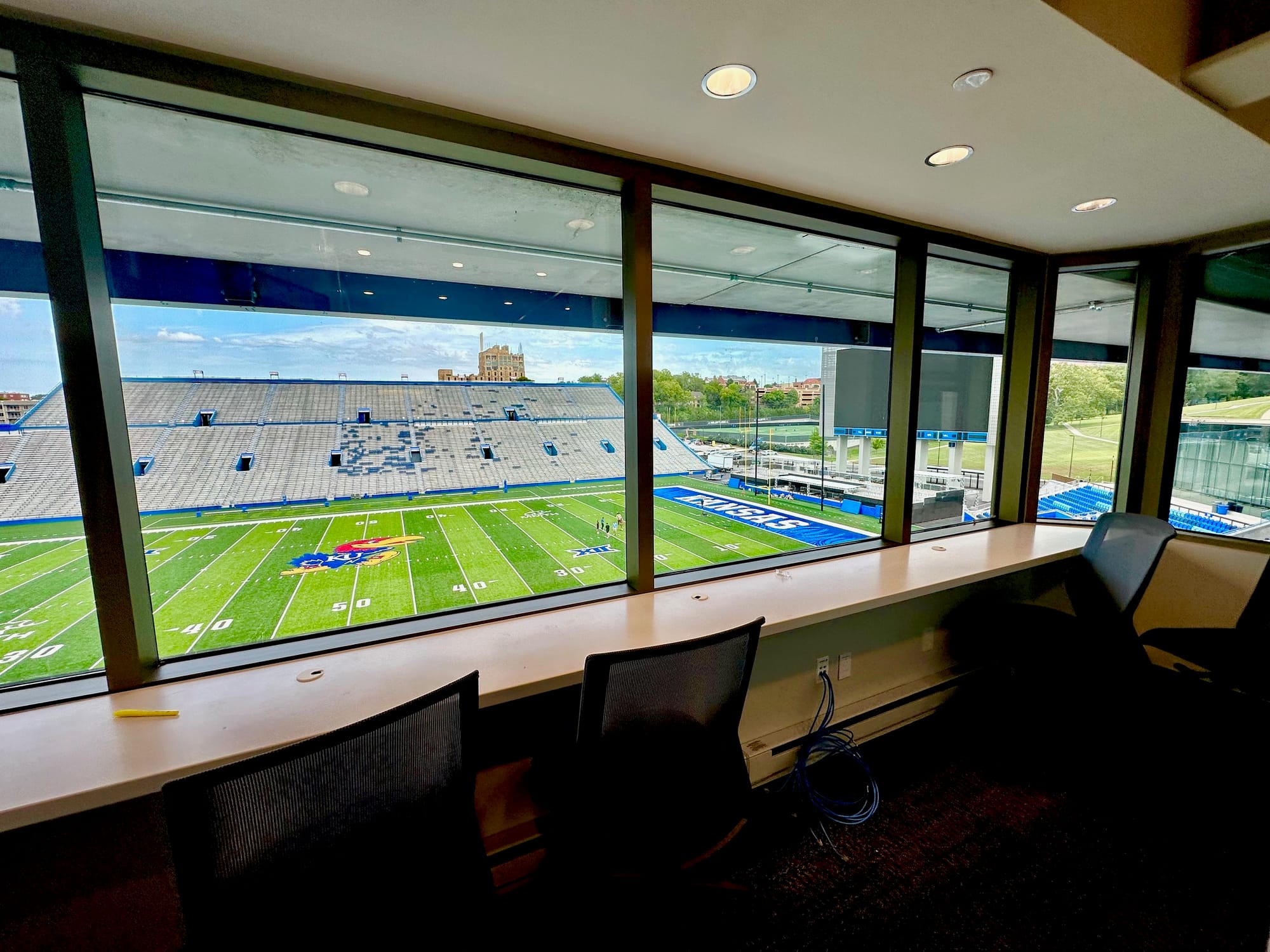 The tour began in the press box — northwest corner instead of the old spot along the west side up from the 50 yard line and spanning the middle of the field — with Goff providing some remarks about rededicating the name of “The Booth” for the man for who it was named back in 2017, KU alum David Booth.