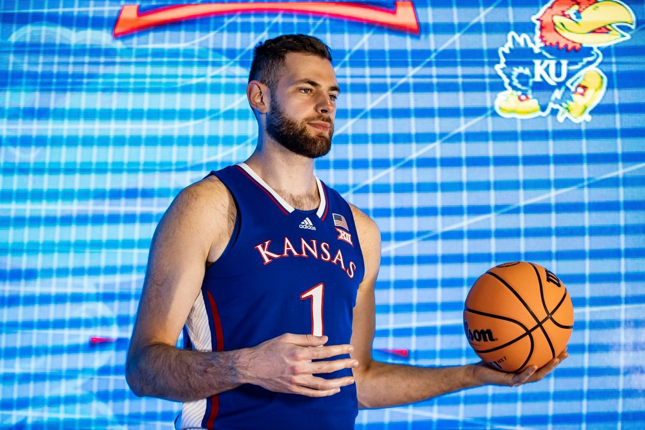 Kansas big man Hunter Dickinson, the Big 12's preseason offensive player of the year, was in Kansas City, Missouri on Wednesday, previewing the upcoming season with head coach Bill Self and teammates Kevin McCullar Jr. and Dajuan Harris Jr. [Kansas Athletics photo]