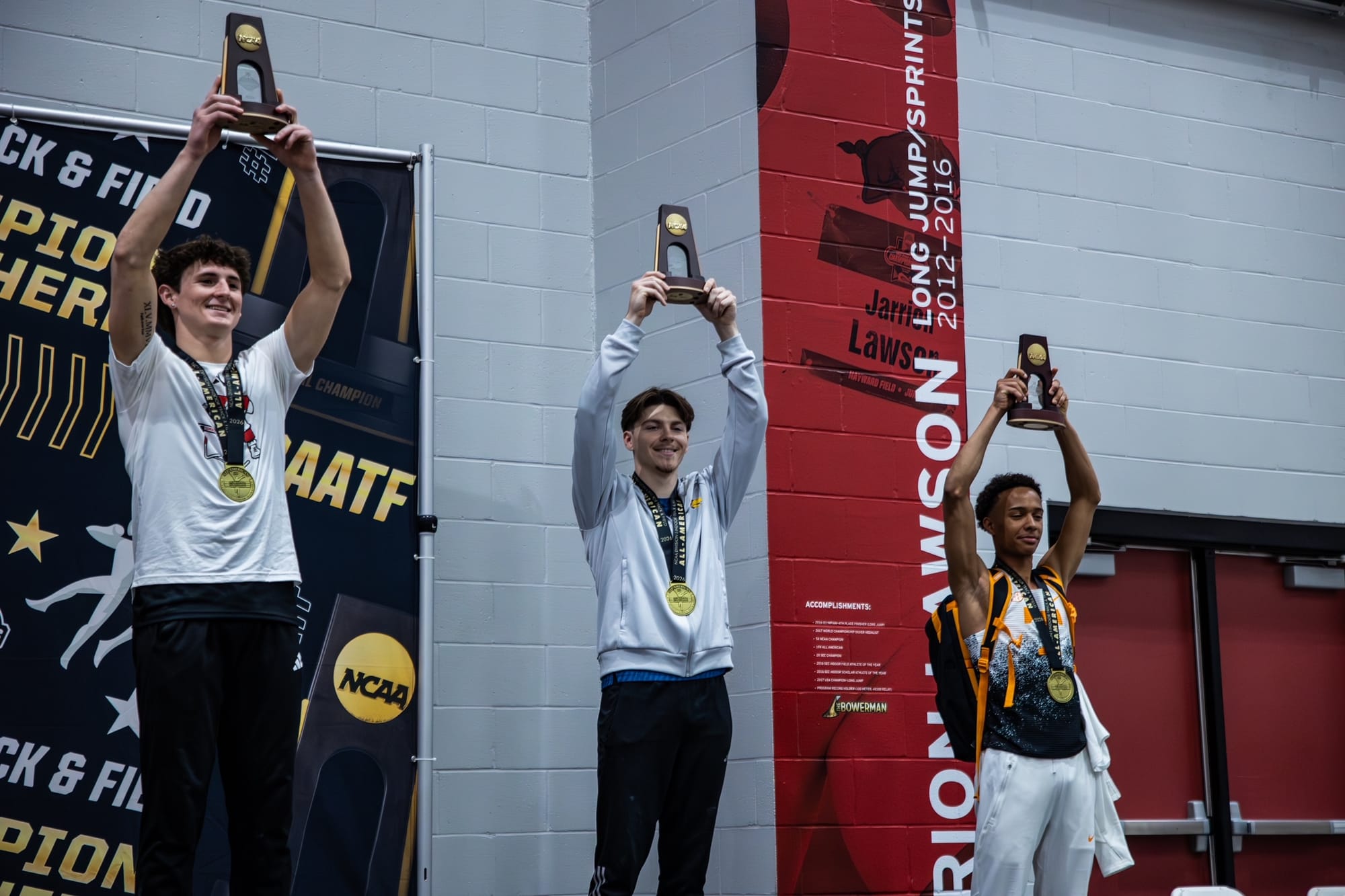 KU senior Anthony Meacham (middle at left) hoists his All-American hardware and, at right, talks with teammate/roommate Ashton Barkdull at indoor nationals earlier this year. [Sydney Allan/Kansas Athletics photos]